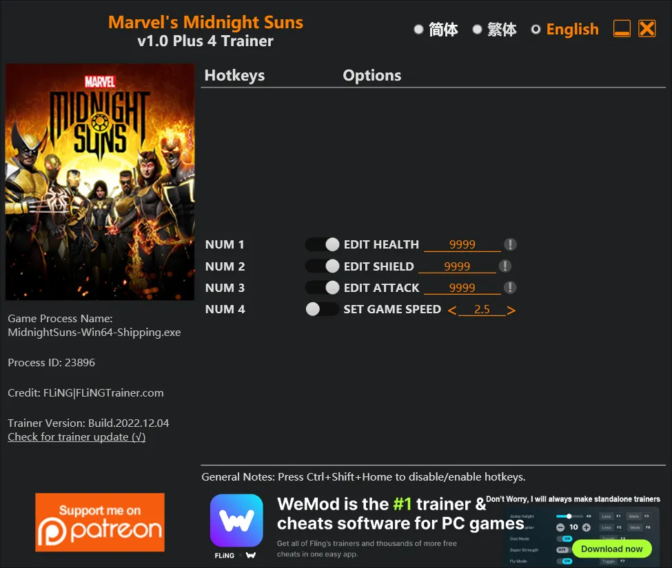 마블 미드나이트 선즈는 마블 유니버스에서 최초로 맞춤설정이 가능한 오리지널 캐릭터에 빙의하여 플레이를 할 수 있는 게임입니다. 외형을 바꿀 수 있고, 선택지를 선택하여 반응을 조율할 수 있습니다. 어벤저스, 엑스맨, 런어웨이즈 등 마블의 캐릭터를 플레이 할 수 있습니다. 당연히 트레이너가 존재합니다. 캐릭터의 체력과 쉴드, 데미지 조정 그리고 게임의 속도까지 조절할 수 있습니다.