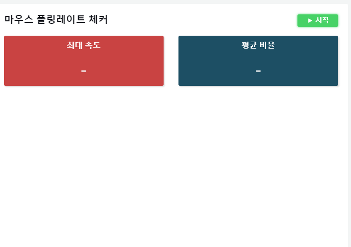 https://devicetests.com/mouse-rate-test에 접속하게 되면 시작 버튼이 있습니다. 녹색의 시작 버튼을 누르고, 최대 속도 및 평균 비율을 측정할 수 있습니다. 브라우저 전체에 적용되기 때문에 브라우저 전체에서 마우스를 원형으로 회전하면 됩니다.