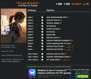 더 라스트 오브 어스 파트1 트레이너 The Last of Us Part I Trainer입니다. 일명 라오어라 불리고 있습니다. 너티 독에서 개발하고 소니 인터랙티브 엔터테인먼트에서 유통하는 액션 어드벤처 게임입니다. 현재는 PlayStation 5와 PC 플랫폼에서 플레이할 수 있습니다. 콘솔에서는 플레이스테이션 스토어에서, PC에서는 스팀과 에픽게임즈 스토어에서 구매할 수 있습니다.