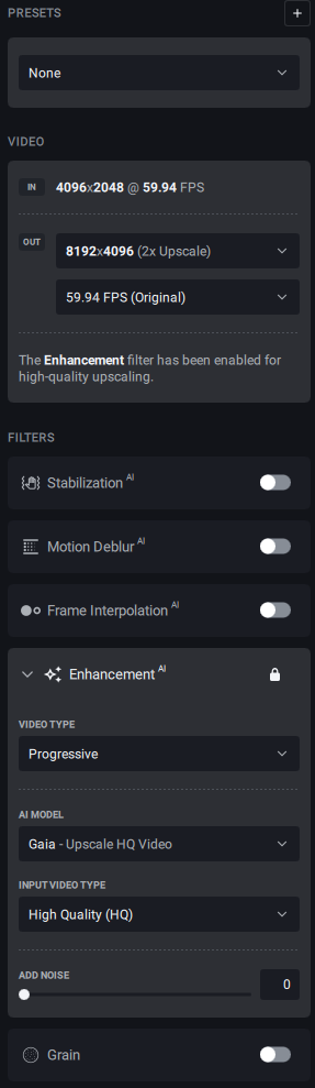업스케일 세팅값입니다. 기존 4090x2040x 59.94FPS의 VR 영상을 8192×4096 2x 업스케일 했습니다. Ai 모델은 Gaia 모델을 이용했으며, 인풋 비디오 타입은 하이 퀄리티를 선택했습니다.